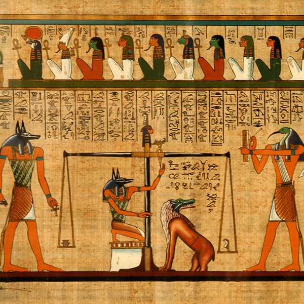 Hemos encontrado un papiro con un fragmento del Libro de los muertos, que contiene un montón de fórmulas mágicas para que el difunto pueda pasar con éxito todos los desafíos que hay en el inframundo o duat, entre ellos el juicio de Osiris y lograr el título de justo de voz para llegar a los campos de juncos (laru o aaru).